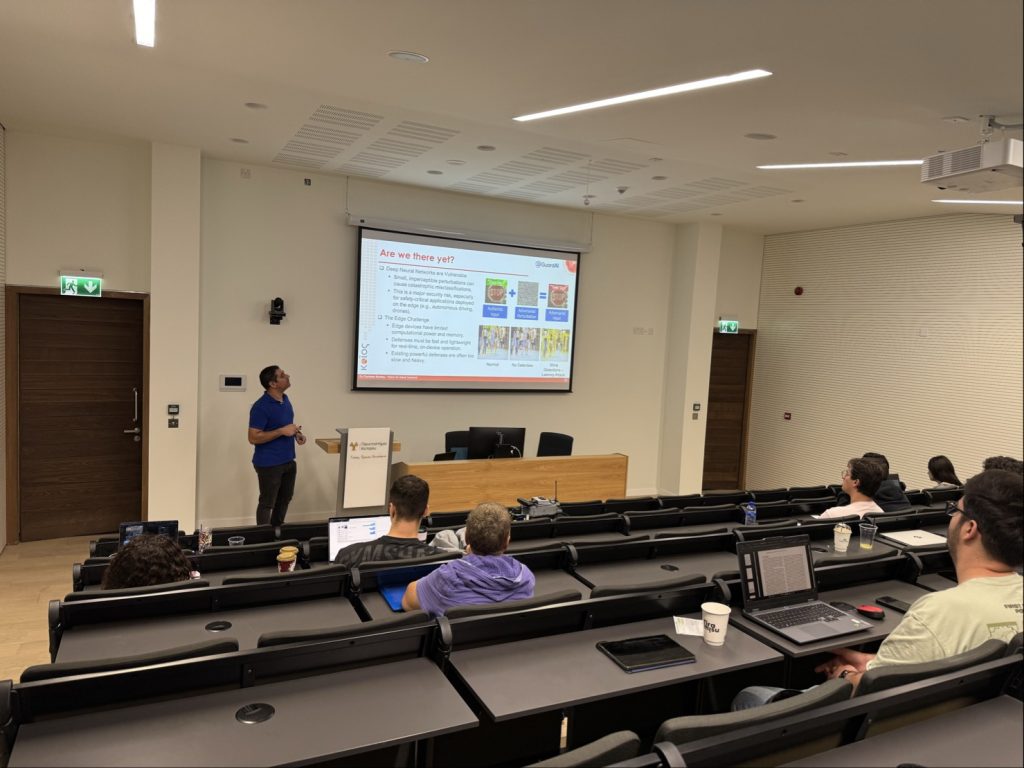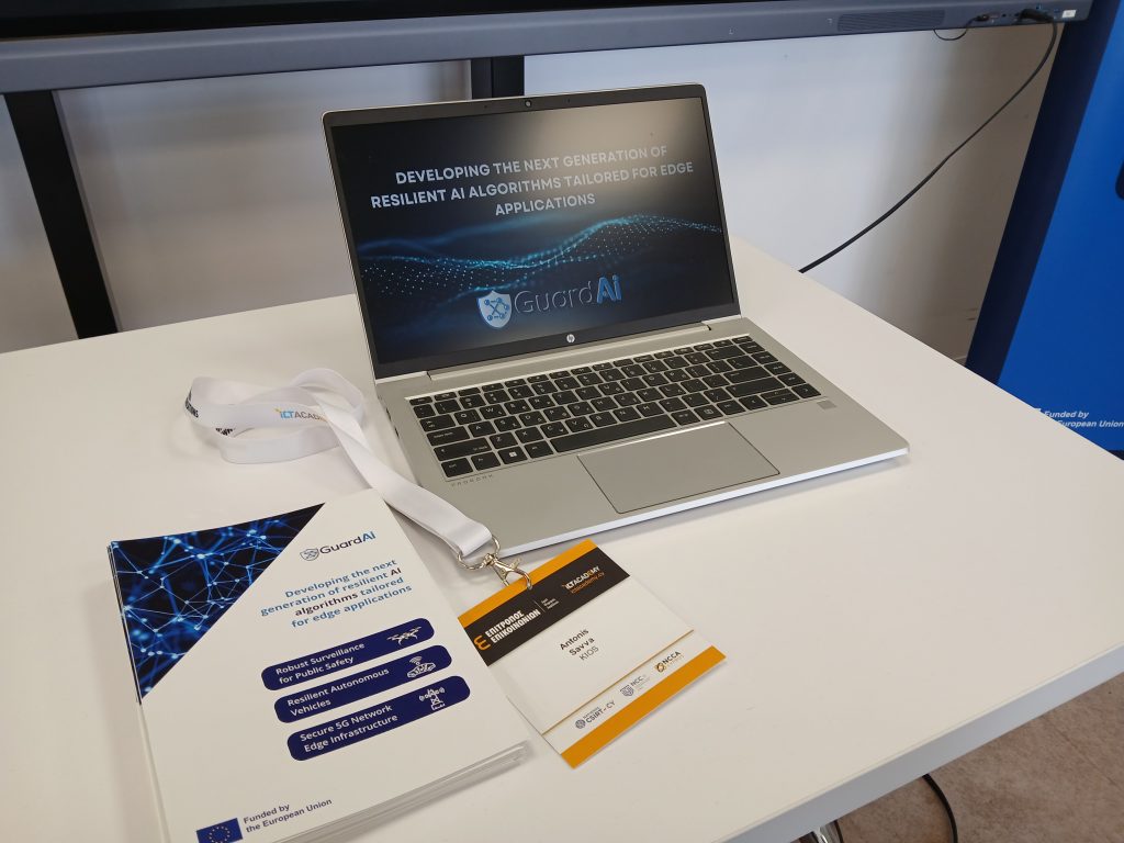 Our partners from the KIOS Research and Innovation Center of Excellence at the University of Cyprus, represented by Research Lecturer Christos Kyrkou, presented ongoing work from the GuardAI project at the 17th Cyprus Workshop on SignalProcessing and Informatics in Nicosia. The presentation focused on the use of distilled and fine-tuned denoising diffusion models for adversarial purification, aiming to enhance the robustness of edge-based vision systems against adversarial attacks.
